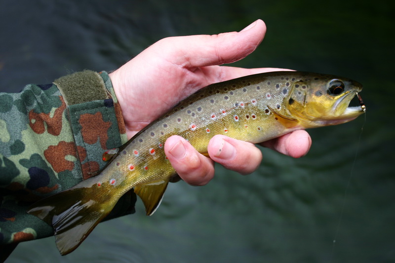 This river we fished in was tricky to wade due to large slippery stones. I warned Harry that he should watch out where to set his feet. It was all in vain though when I heard a loud splash, Harry went swimming but fortunately he stayed sound and safe. On the piece of water I had chosen it was normal to catch 5 or more fish in a short time but now nothing happened, even deep-fished nymphs where left untouched. For me skunk was avoided when a tiny brown trout decided to nail the Czech nymph I was fishing.