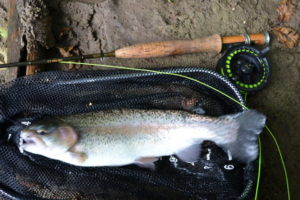 I walked into the river and on my third cast I hooked into a very lively Rainbow trout.