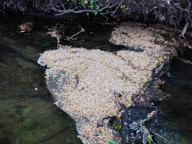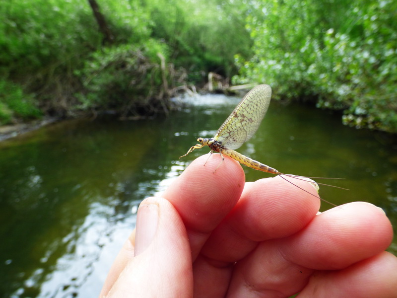 The mayfly landed near the bank and as it drifted close to the brushes