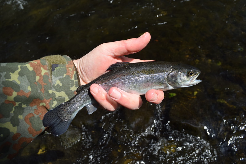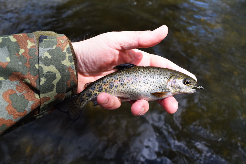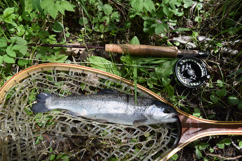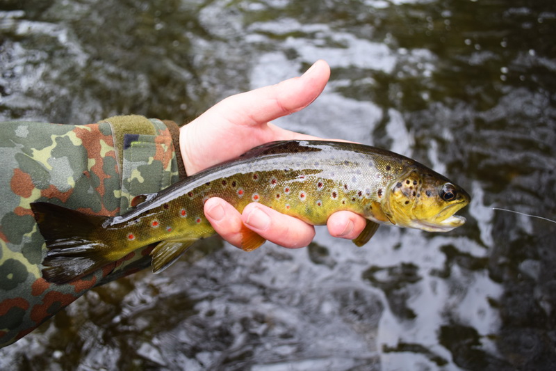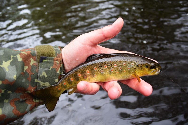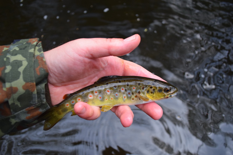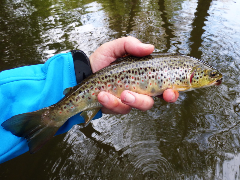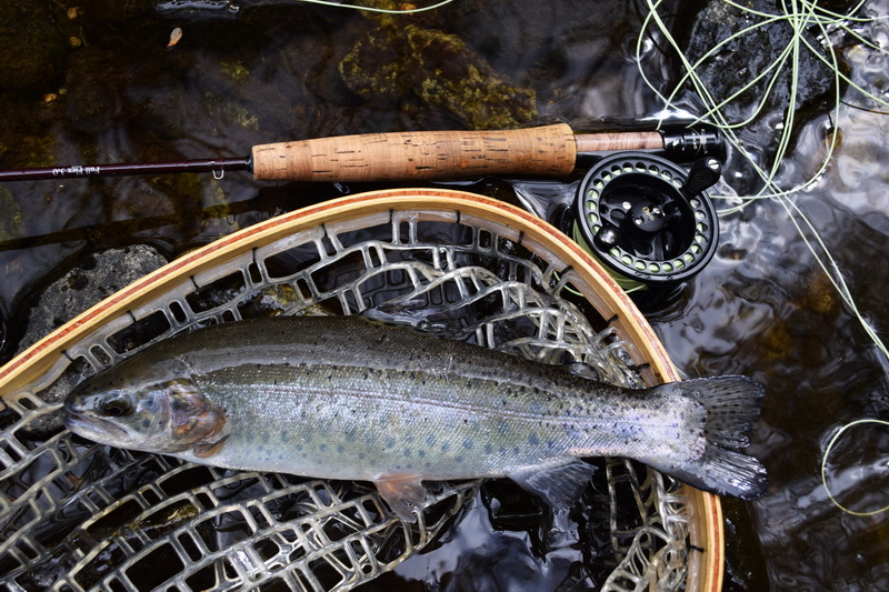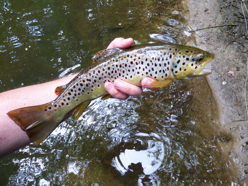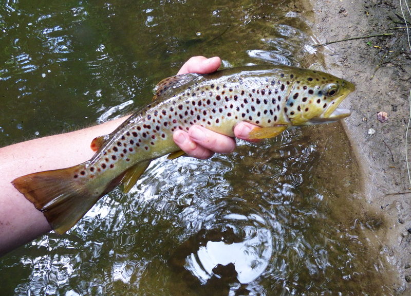 Missed two trout in the afternoon but hooked a good one just before the rains started.