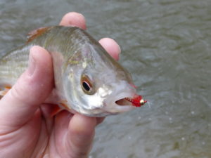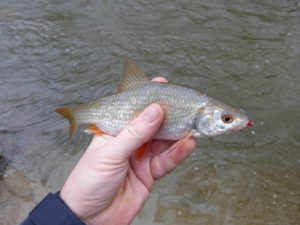 In one of the deeper pools a quiet eddy yielded a first bite on the nymph and a very nice roach