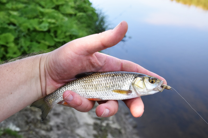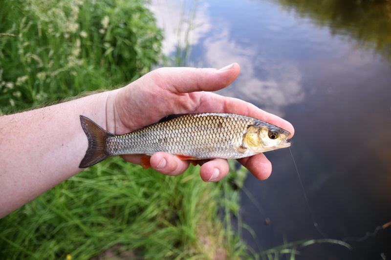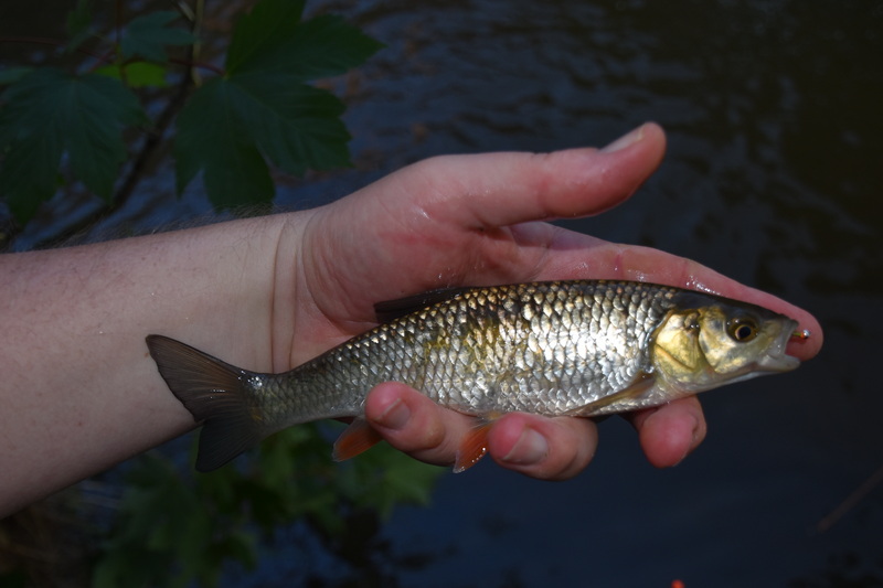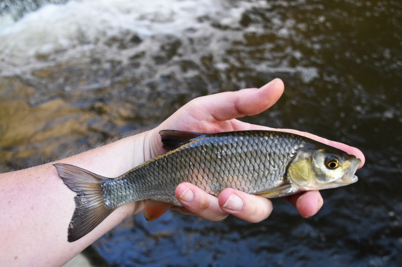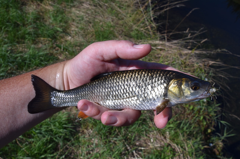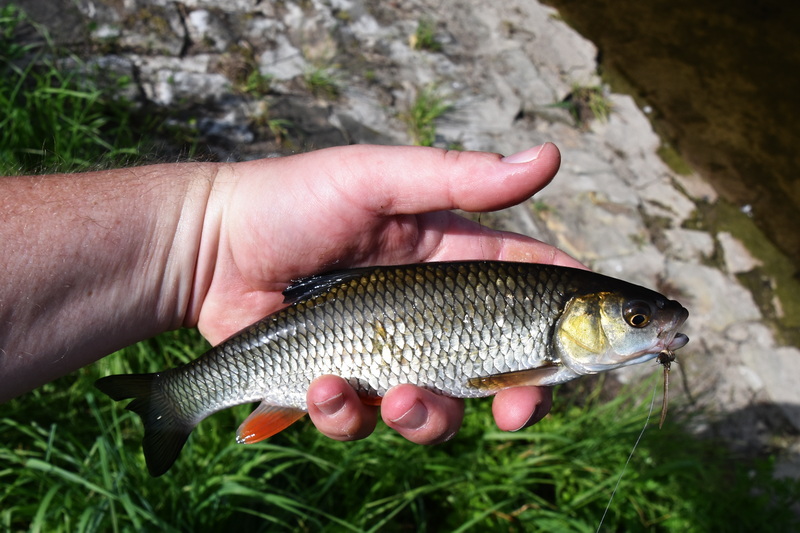 Clouds soon became thicker and it actually started to rain. I sheltered under the bridge and noticed some fish moving about. As the hopper did not seem to entice the fish I tried a sedge and tossed it to a school of fish. Surprisingly a dace hit the fly instead of the present chub.