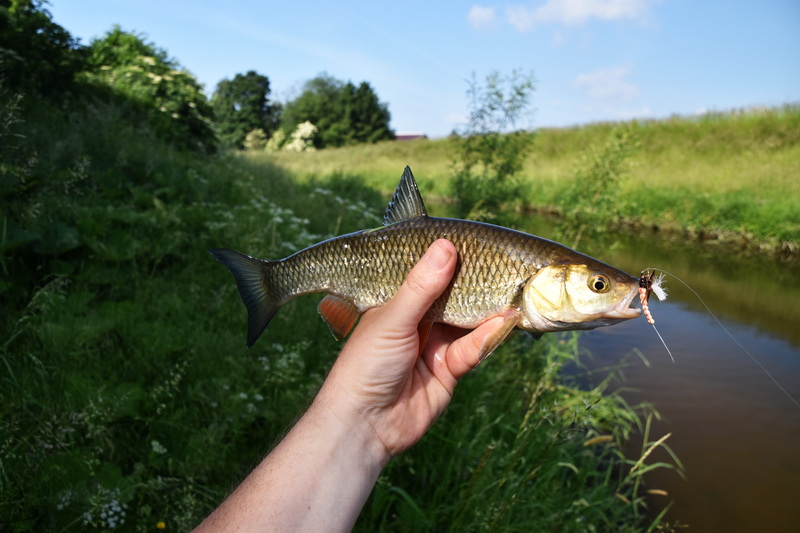 With the targets running out I went downstream to a stretch that usually was guaranteed to hold fish most of the year. When I looked down from the bridge I noticed big chub. The problem was that the steep banks where not mowed yet and the grass was manhigh so I could not toss a fly from downstream. The approach from upstream utterly failed as I was spotted by the fish and caused the fish to run.