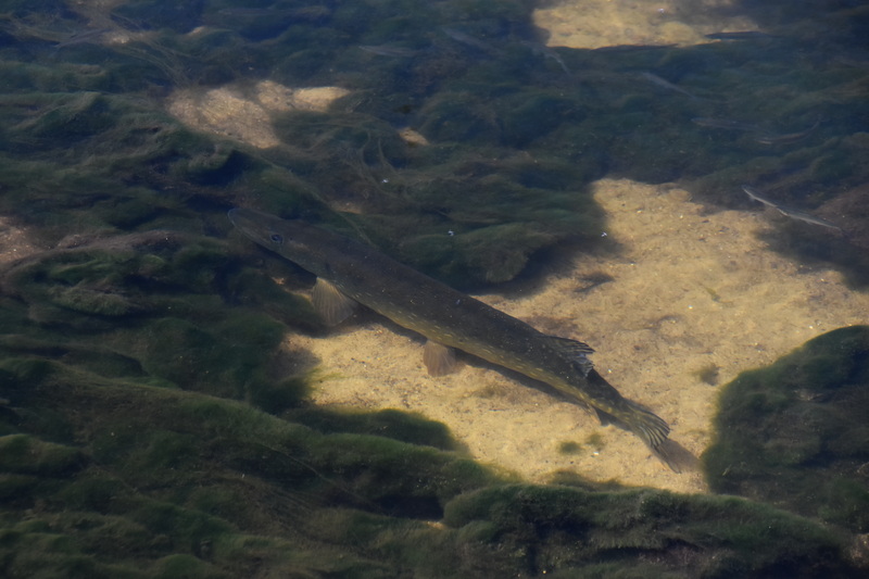 I spotted again a pike along the bank, it had seen me first though and retreated to deeper water. Further upstream I noticed the big chub and I made a good cast near them without scaring any fish. One came up and nailed the fly, I battled the fish successfully but just before I could net it the fish got off.